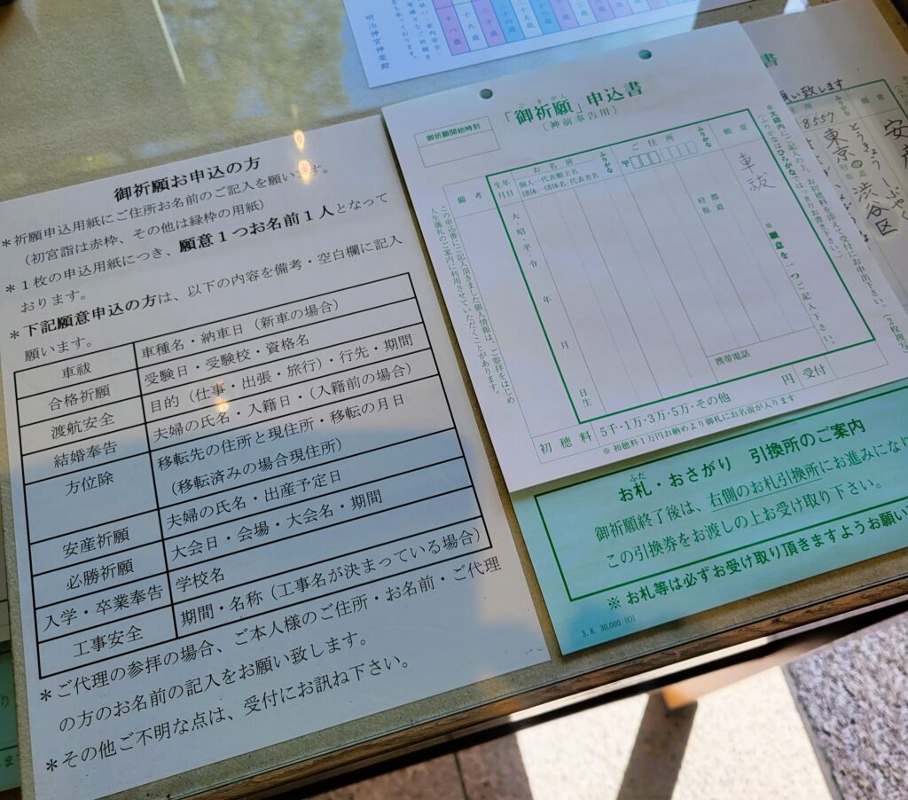 神楽殿入ってすぐに申込用紙があるので、住所・氏名・生年月日と目的(車祓い)を記載してから受付に並びましょう。