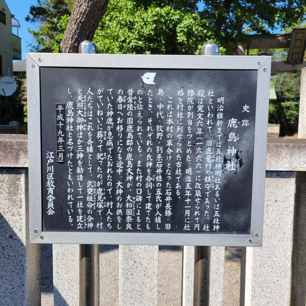 境内には鳥居や小さな祠が数か所あり、四季折々の行事やお祭りも行われ、地元の氏子だけでなく参拝者も訪れる神社で、江戸川区内で鹿島神宮の御分霊を感じられる貴重な場所として知られています。