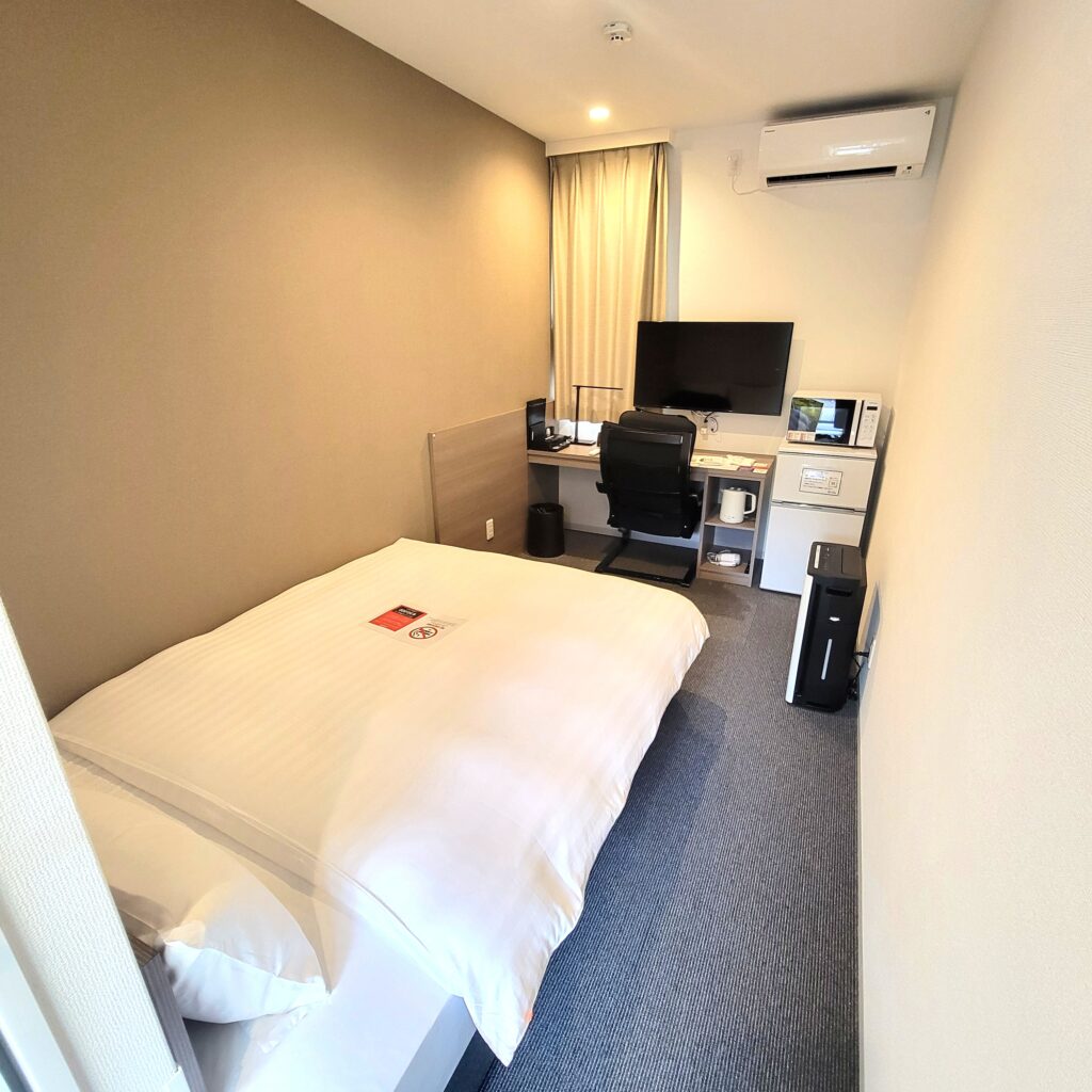 「HOTEL R-9 The Yard Fukuyama」は、シンプルな客室と便利な立地にある 快適なホテルでした。足元がタイヤ構造なので、少し揺れを感じる時もありましたが、個室はしっかり遮音されていて、近隣の声も聞こえませんし、設備もキレイなので全く問題なく快適に過ごせました。価格もリーズナブルなので、観光や出張などコスパ重視の方にはとてもおススメのホテルです。