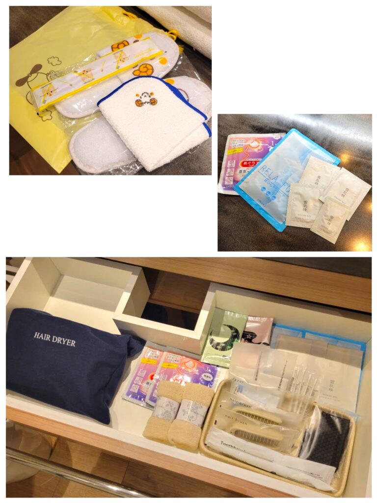 ホテルのアメニティグッズはとても充実しており、大人だけでなく子ども用のセットも用意されています。さらに、リラックス効果のあるホットアイマスクや、観光や出張で歩き疲れた足を癒してくれる貼るシップなど、細やかな心配りが感じられるラインナップです。快適に過ごせる工夫が整ったホテルなので、家族連れや女性の旅行にも安心して利用できます。