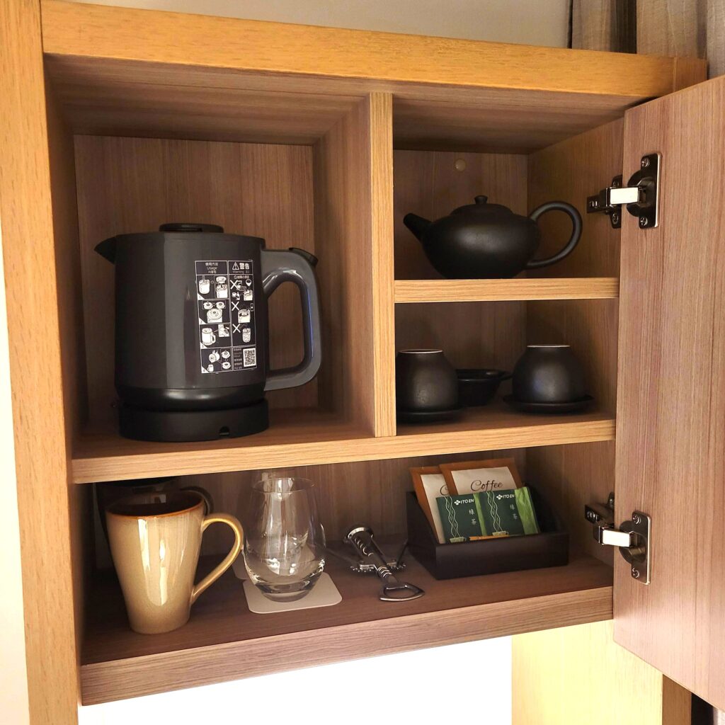 戸棚にはポットやグラス、お茶やワインオープナーなどの備品もおしゃれにディスプレイされています。
