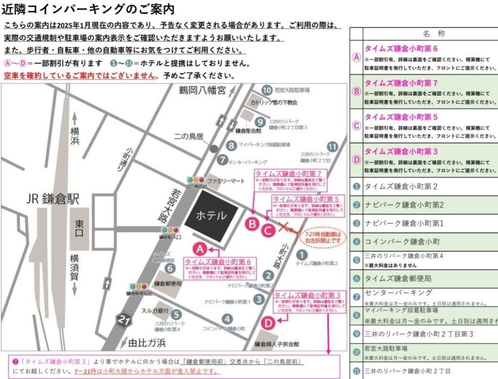 ゆうこ私の場合、高さ制限が気になったので、ホテル横のB『タイムズ鎌倉小町第7』に停めました。夕方から翌朝9時までの駐車で料金は1,300円でした。